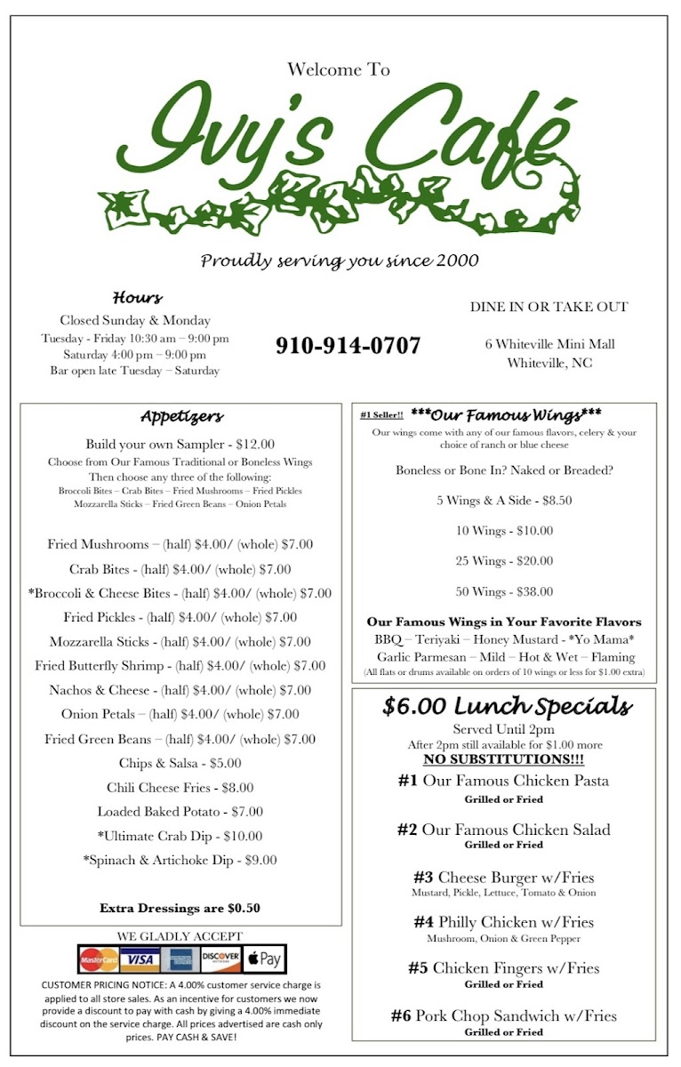 Welcome to Ivy's Cafe, a delightful gem nestled in the Mini Mall of Whiteville, NC. This cozy café is a go-to spot for those seeking hearty meals and genuine hospitality. Their menu boasts mouthwatering offerings, with standout items like the seasoned Philly Steak or Chicken Sandwich, and the famed Yo Mama Sauce that complements their other dishes perfectly.